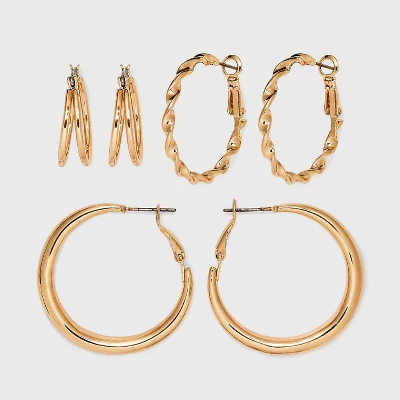 Add a variety of designs and sleek style to your accessories collection with this 3-Pair Twisted and Duo Hoop Earring Set from Universal Thread™. This set of earrings includes three pairs — one pair of twisted hoops, one pair of large hoops and one pair of duo hoops — to add variety to your everyday looks. Each pair boasts a nickel-free construction to suit all types of skin, and their clip-in clasp closures help keep the earrings securely in place as you go about your day.